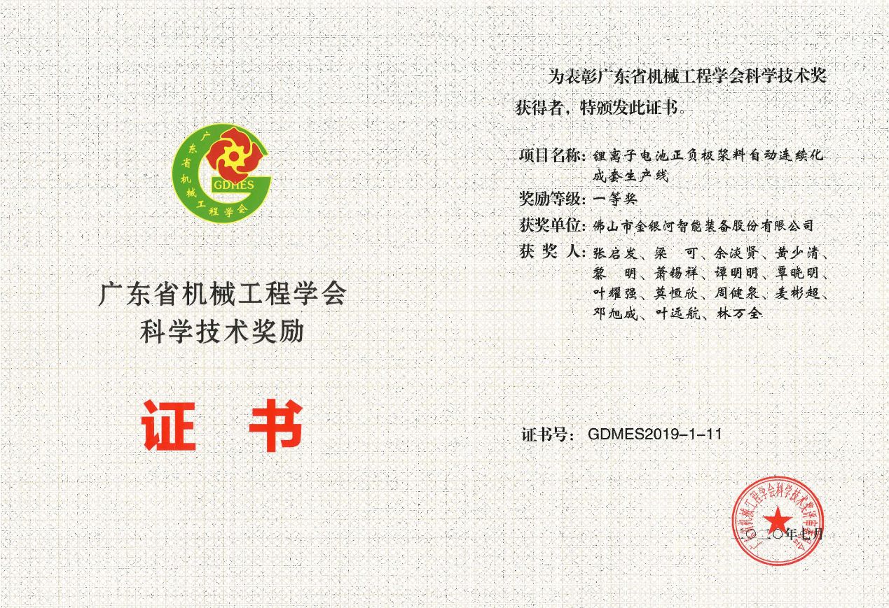 2020年7月,蝌蚪蜗精品视频在线观看项目“小蝌蚪视频APP污下载电池正负极浆料自动连续化成套生产线”被广东省机械工程学会授予“广东省机械工程学会科学技术一等奖”。