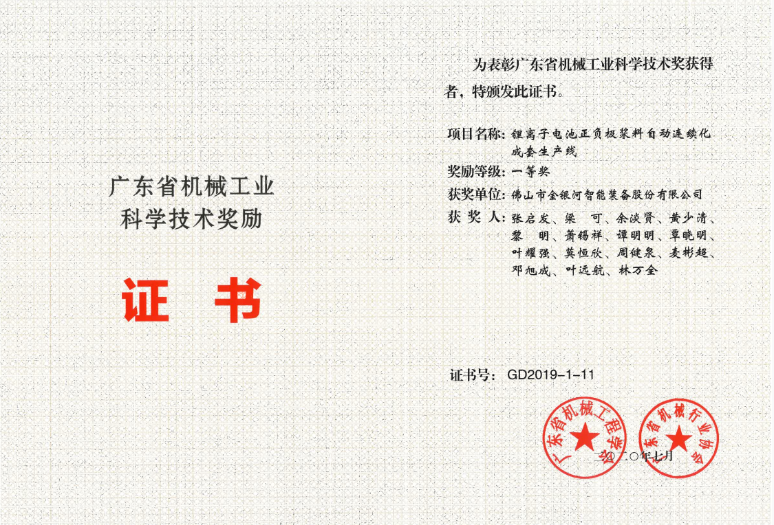 2020年7月,蝌蚪蜗精品视频在线观看项目“小蝌蚪视频APP污下载电池正负极浆料自动连续化成套生产线”被广东省机械工程学会、广东省机械行业协会授予“广东省机械工业科学技术一等奖”。