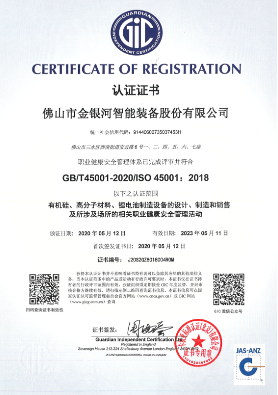 2020年5月,蝌蚪蜗精品视频在线观看“职业健康安全管理体系”完成评审并符合GB/T45000-2020/ISO 45001:2018,认证范围包括小蝌蚪APP黄色版在线免费下载、高分子材料、锂电池制造设备的设计、制造和销售及所涉及场所的相关环境管理活动。 蝌蚪蜗精品视频在线观看严格遵守国家关于职业健康安全方面的法律、法规、安全管理标准和技术规范,履行向国家主管部门和社会的承诺,通过管理水平的提升,提高员工的安全运营意识,规范企业的行为,实现职业健康安全绩效的持续改进,为企业的持续发展保驾护航。