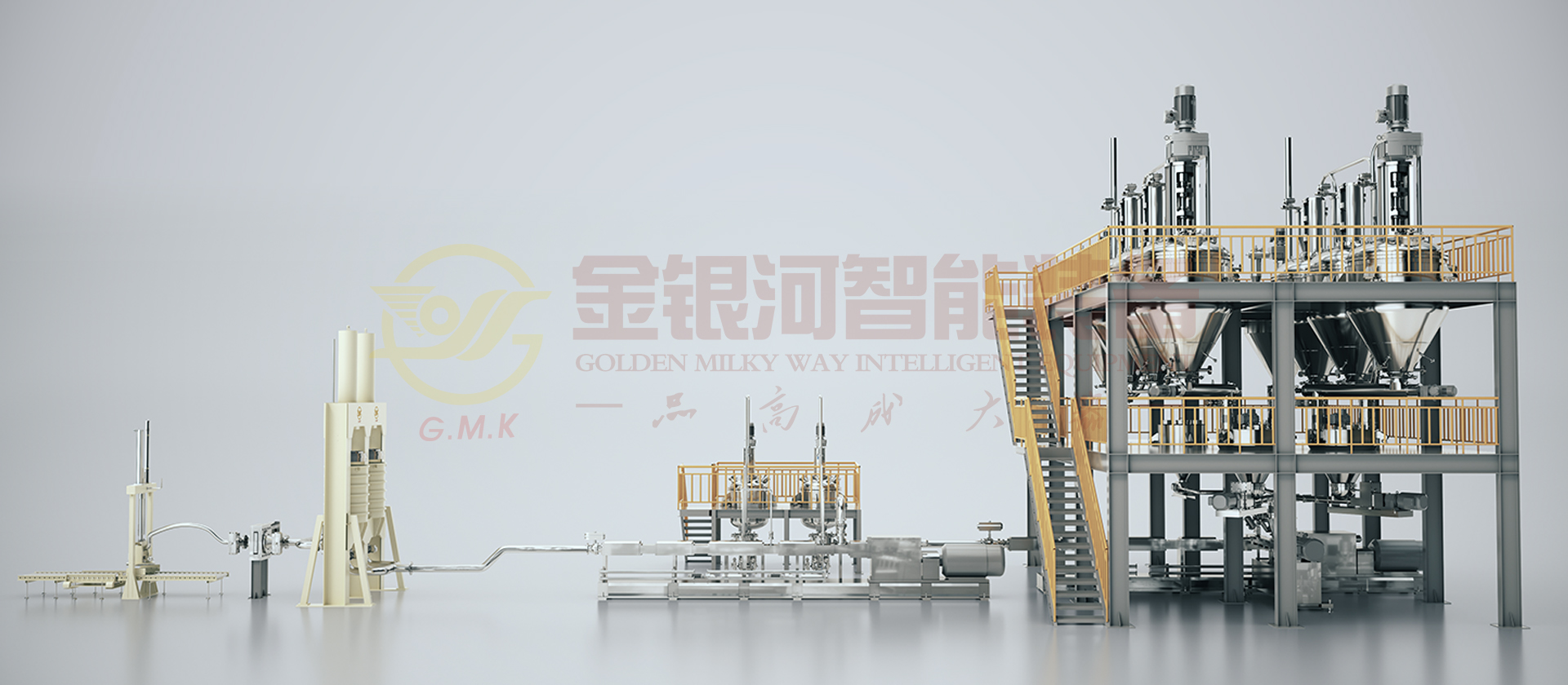 由计量斗、称量及输送系统、贮罐、冷却器、多工位出料机、喂料机、双螺杆螺旋混合机、在线烘干、冷却粉体装置、辅助设备及DCS中央控制系统组成。原材料(粉体与液体)通过精确的计量系统在线自动和连续输送到螺旋混合机中,在一阶螺旋混合机中完成混合、分散、研磨、抽真空等产出基料后入二阶螺旋混合机,通过在线加入助剂至其中,再次完成混合、分散、研磨、抽真空等完成品料制作并输出进入多工位出料机暂存,多工位机出料机轮流交替出料过滤包装。它的生产效率高,适合大规模生产;它具有自动化程度高,杜绝物料直接接触空气,产品质量稳定性好,物料及能源损耗少等优点。