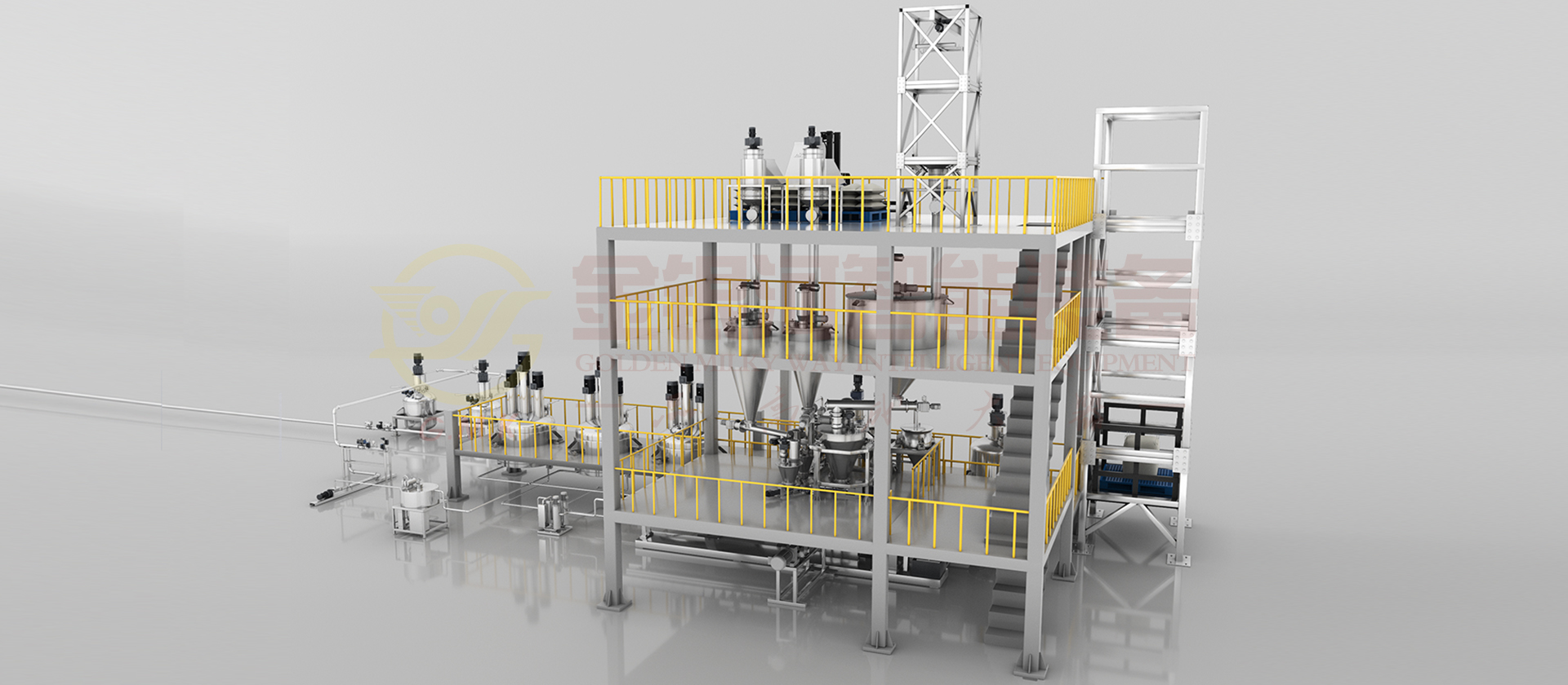 由计量斗、称量及输送系统、贮罐、制胶罐、中转罐、喂料机、高速混料机、增压泵、磁性式过滤器、高速均质机、辅助设备及DCS中央控制系统组成。锂电池的正、负极原材料(粉体与液体)通过精确的计量系统在线自动和连续输送到螺旋混合机中、在螺旋混合机中完成混合、分散、研磨、抽真空等操作形成浆料,然后浆料连续从螺旋混合机中输出进入下道生产工序。它的生产效率高,适合大规模生产;它具有自动化程度高,杜绝物料直接接触空气,产品质量稳定性好,物料及能源损耗少等优点。